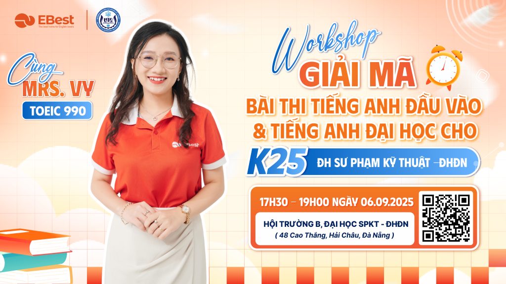 Để giúp hành trình học tiếng Anh của các bạn tân sinh viên Khoá 2025 dễ dàng hơn, EBest tổ chức một buổi workshop: “Giải Mã Bài Thi Tiếng Anh Đầu Vào & Tiếng Anh Đại Học Cho K25”. Đây chính là chìa khóa để hành trình học tiếng Anh tại đại học của bạn trở nên dễ dàng và tối ưu nhất.