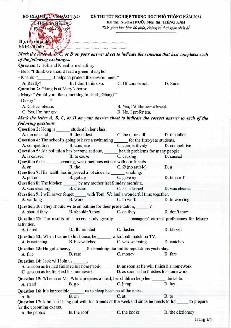 Dưới đây là Đề thi tham khảo môn Tiếng Anh tốt nghiệp THPT năm 2024 do Bộ GD&ĐT công bố.