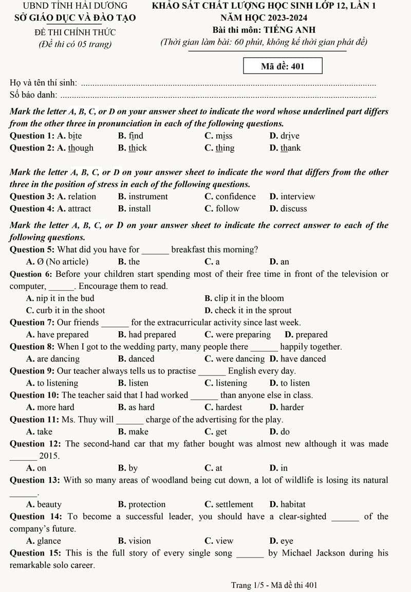 c. Đề thi thử tốt nghiệp THPT 2024 môn Tiếng Anh – Sở GD&ĐT Hải Dương (có đáp án)