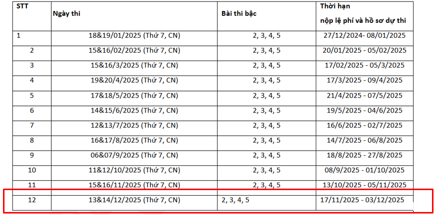 - Kỳ thi cuối cùng trong năm nay sẽ diễn ra vào ngày 21/12/2025.