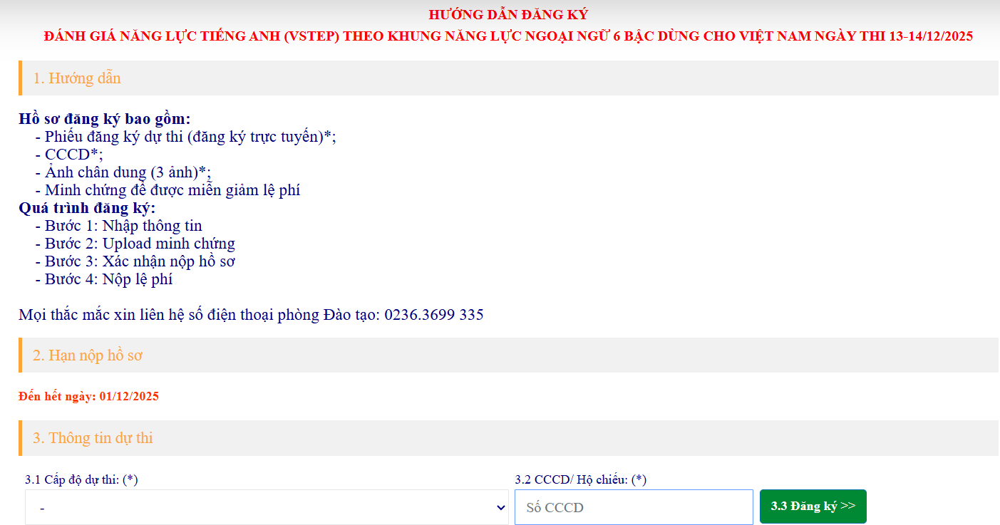 + Hướng dẫn các bước đăng kí thi trên link: https://vstep.ufl.udn.vn/NLTA/