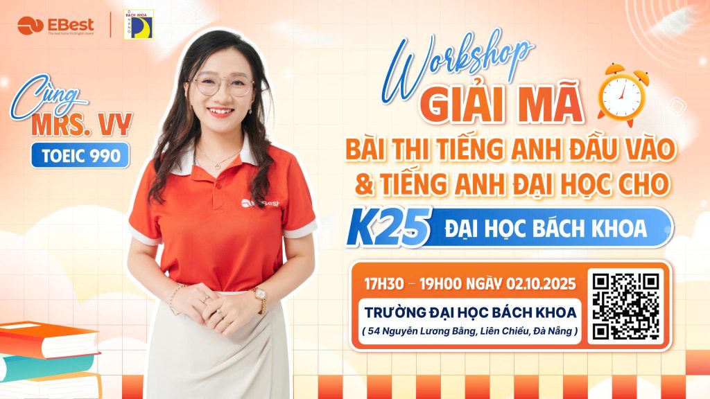 Để giúp hành trình học tiếng Anh của các bạn tân sinh viên Khoá 2025 dễ dàng hơn, EBest tổ chức một buổi workshop: “Giải Mã Bài Thi Tiếng Anh Đầu Vào & Tiếng Anh Đại Học Cho K25”. Đây chính là chìa khóa để hành trình học tiếng Anh tại đại học của bạn trở nên dễ dàng và tối ưu nhất.